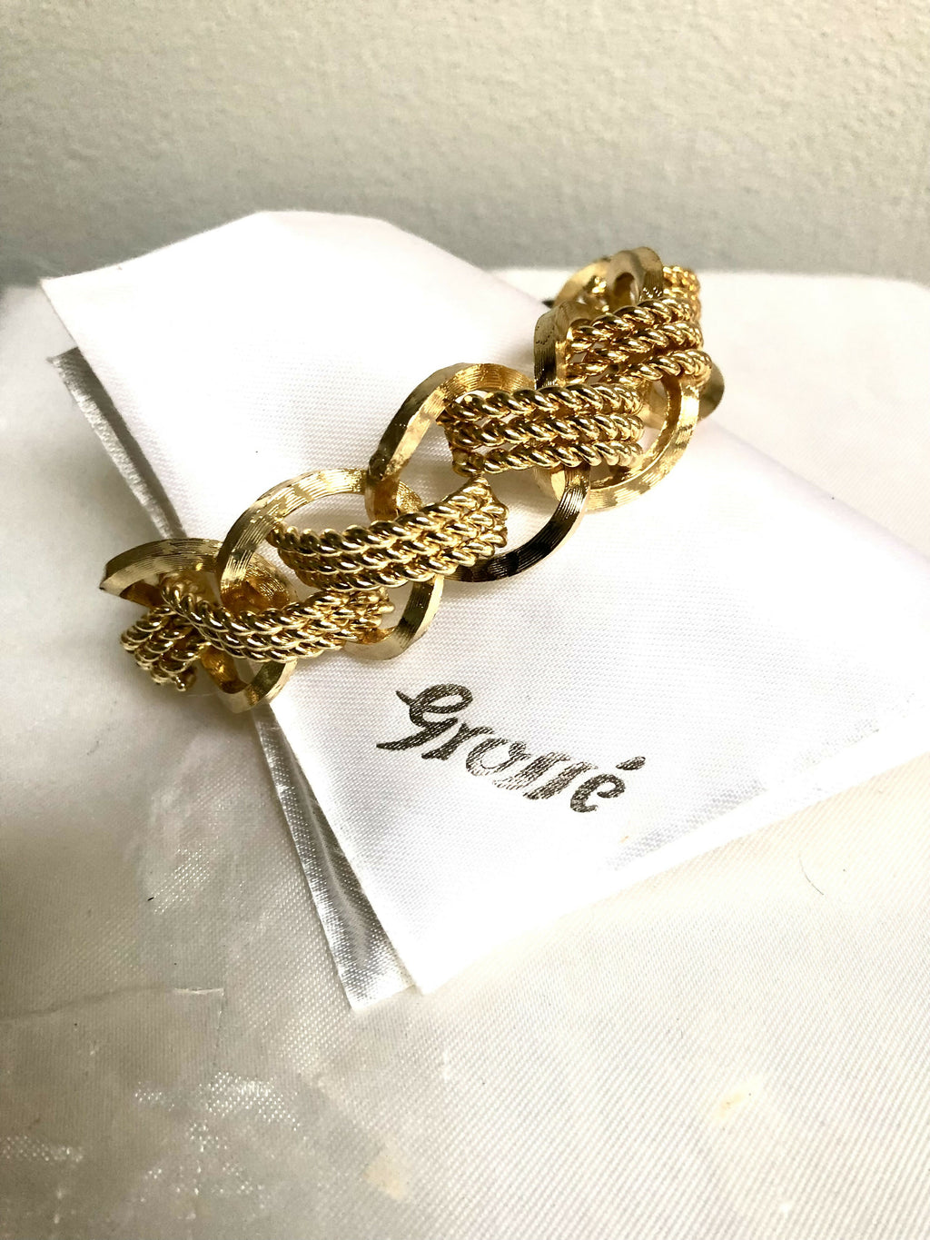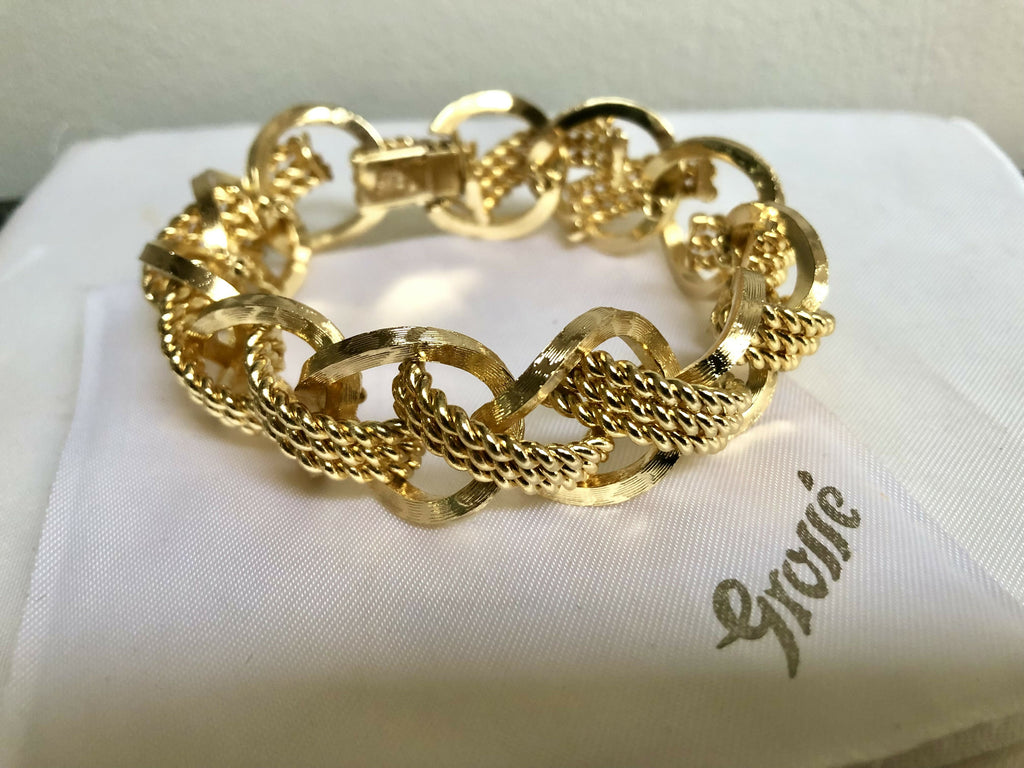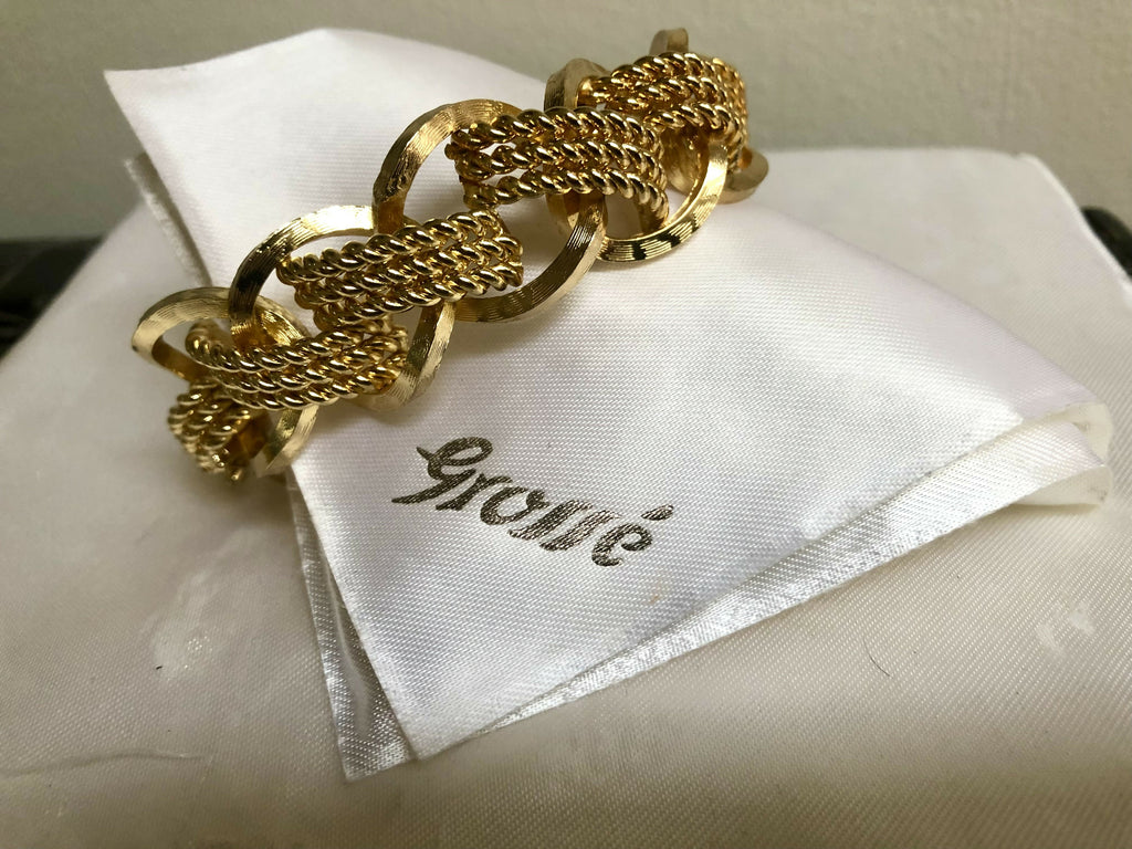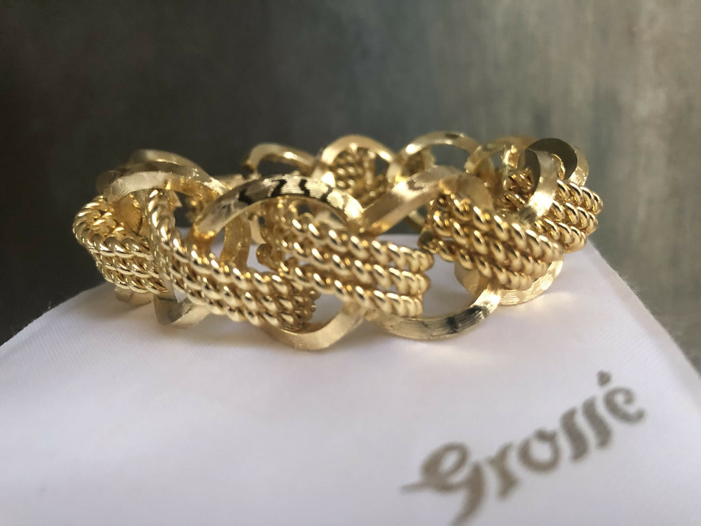 Step into timeless glamour with this vintage 1968 Grosse gold-plated bracelet, a stunning piece of mid-century German design. Crafted with bold textured links intertwined with twisted rope details, this luxurious bracelet captures the elegance and sophistication of the era.