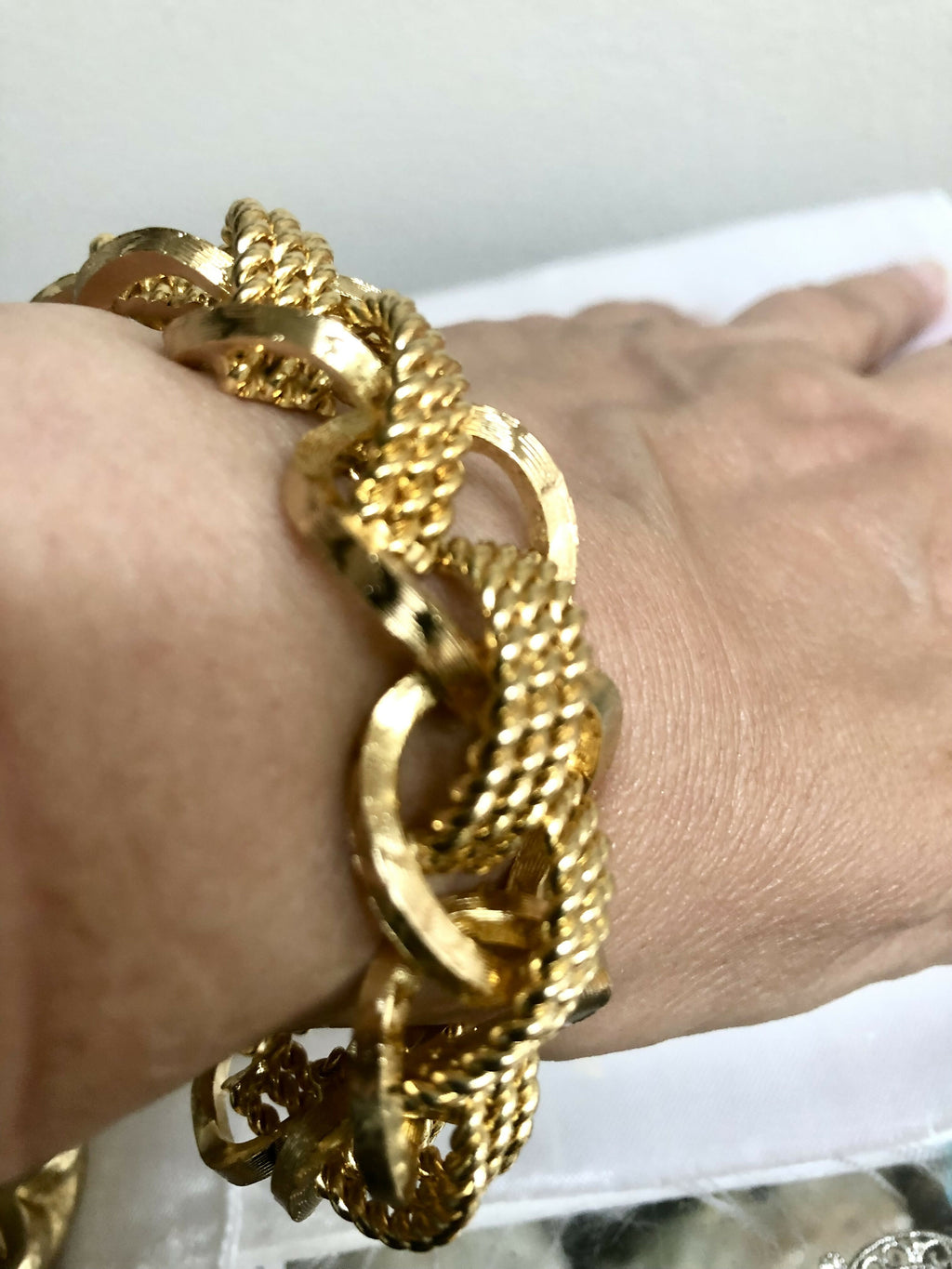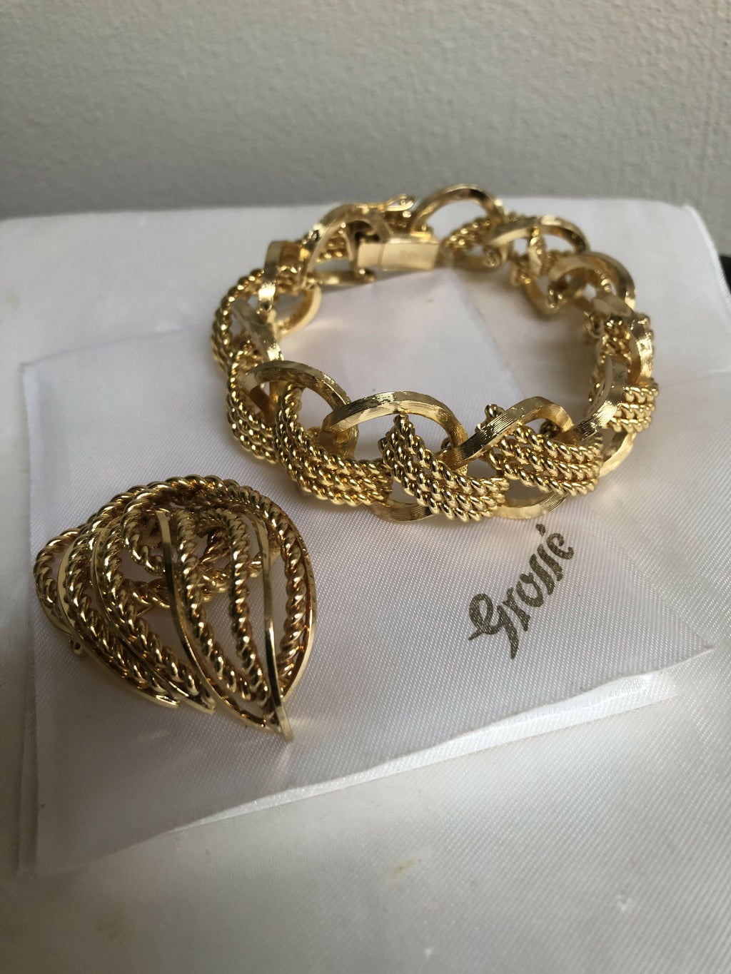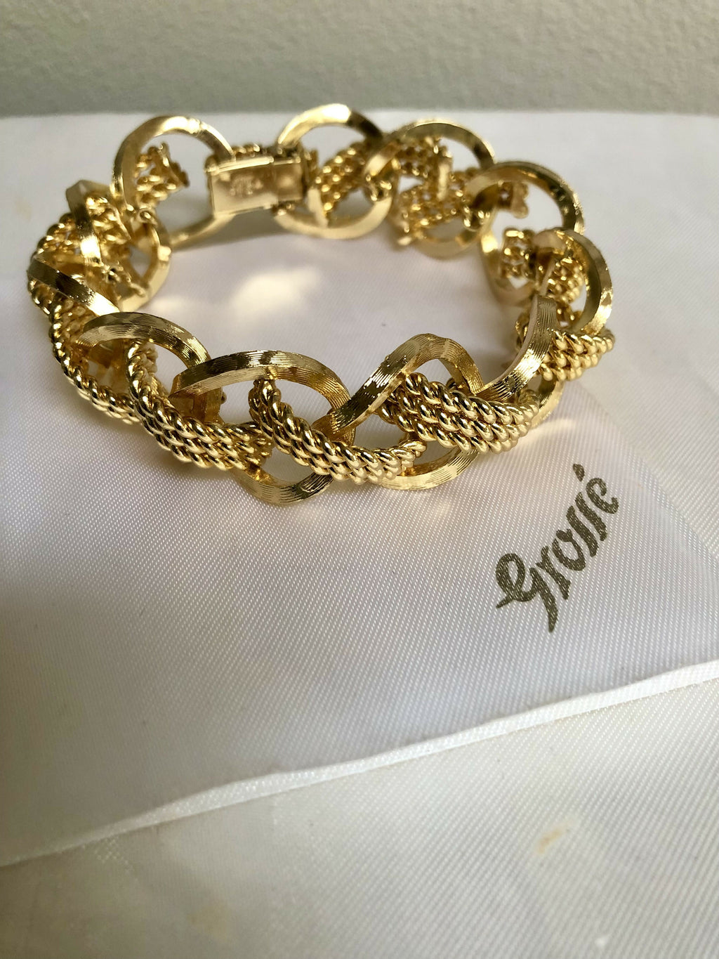 Step into timeless glamour with this vintage 1968 Grosse gold-plated bracelet, a stunning piece of mid-century German design. Crafted with bold textured links intertwined with twisted rope details, this luxurious bracelet captures the elegance and sophistication of the era.