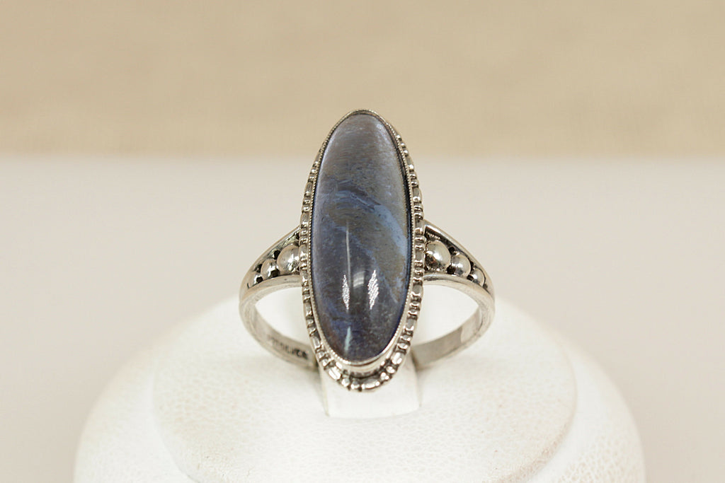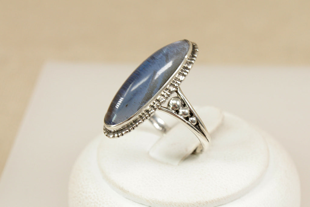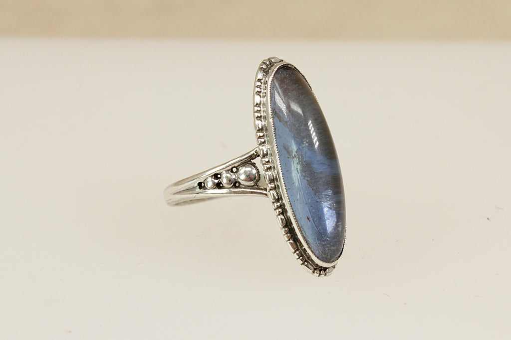 A captivating vintage sterling silver ring, showcasing a striking navette-shaped Labradorite cabochon with a beautifully high domed cut. The stone shimmers with translucent flashes, changing with every movement and catching the light like magic.