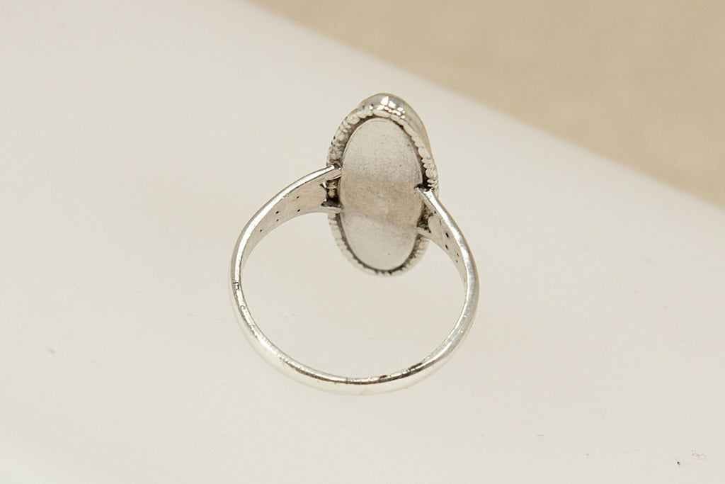 The bezel setting is surrounded by delicate silverwork, adding an ornate touch that continues along the finely detailed shoulders. The setting is flat-backed, allowing the stone’s profile to sit proudly atop the finger. Inside the band, it is clearly stamped SILVER 925, confirming its sterling silver quality.