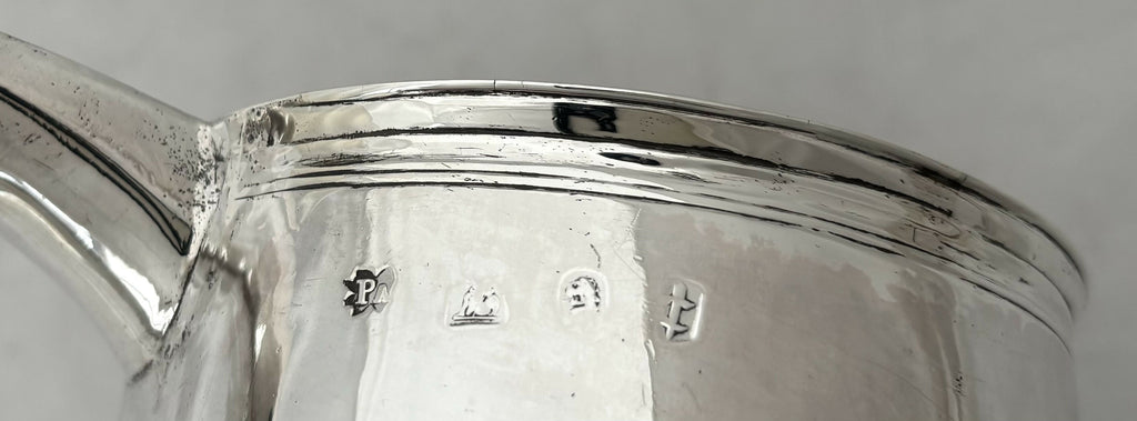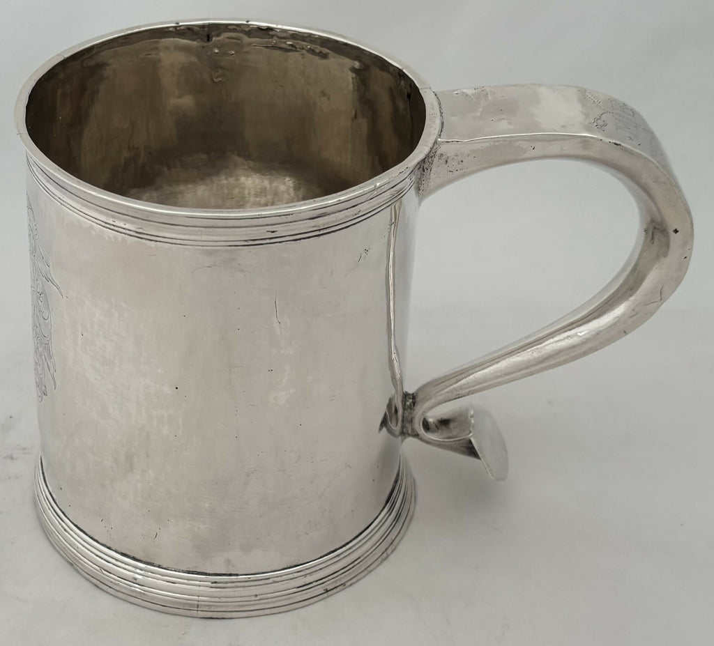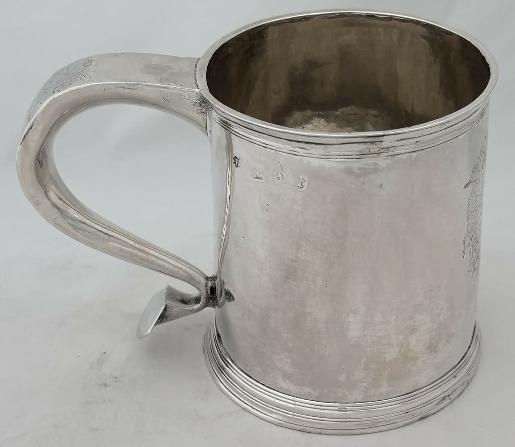 In good condition being free of any major dents and splits. Evidence of repairs and minor crushing at the handle joints. Minor denting to the handle. Hallmarks rather rubbed but still readable. Armorial and monogram clear and crisp. The tankard does not leak.